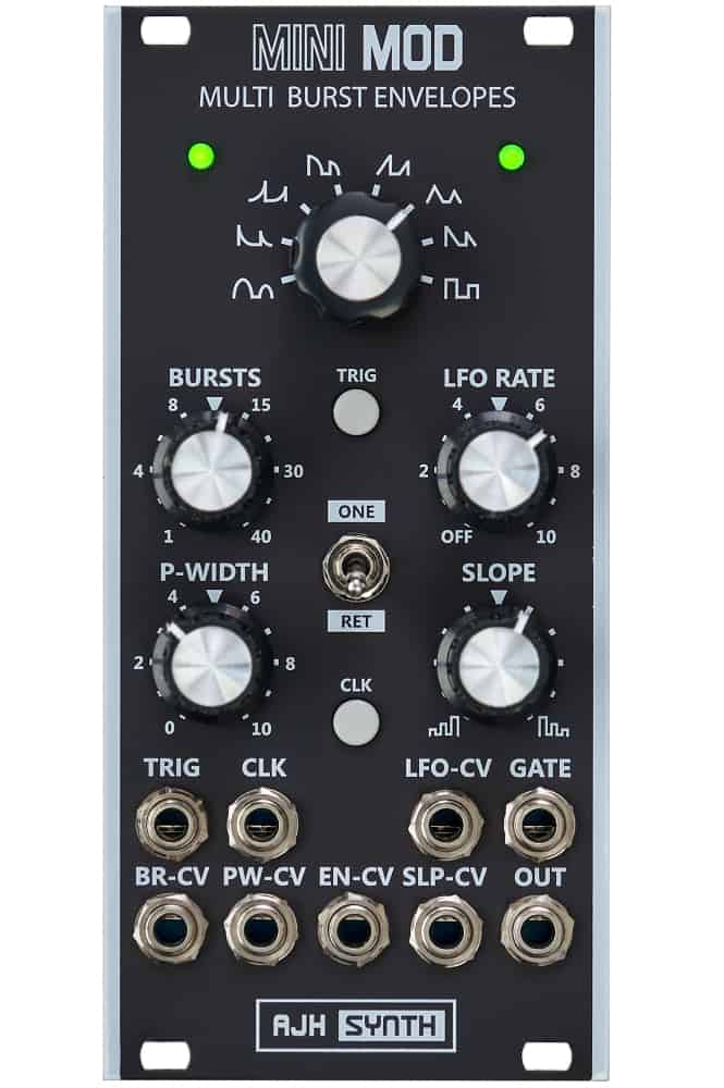 Le module MiniMod Multi Burst Envelopes génère des rafales d’enveloppes répétitives de longueur variable qui peuvent changer dans le temps, avec un contrôle CV de toutes les fonctions.