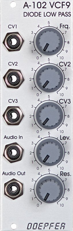 Only the filter sound is different: manual control of filter frequency 3 CV inputs (CV1, CV2, CV3), 2 of them with attenuator (CV2, CV3) input level control resonance control up to self oscillation (depends upon the frequency setting for the A-102)